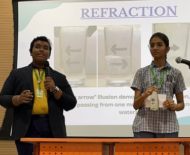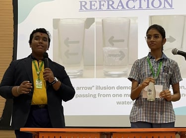 Kavya amazed everyone by showing how a water-filled bottle could invert an arrow when viewed from the opposite side, clearly illustrating the bending of light—or refraction.