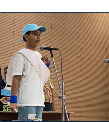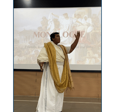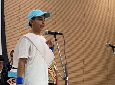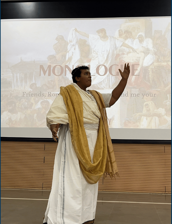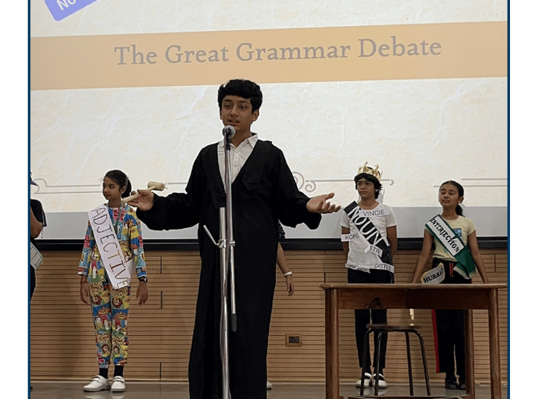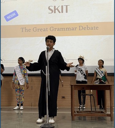 The assembly took a creative turn with a witty and educational skit titled “The Great Grammar Debate,” where punctuation marks and parts of speech battled in a humorous courtroom setting to assert their importance in the language. It was followed by a powerful monologue from Shakespeare’s Julius Caesar — the famous speech by Mark Antony, skillfully delivered by Tirth Parmar, leaving the audience enthralled.