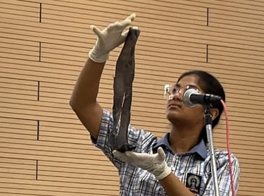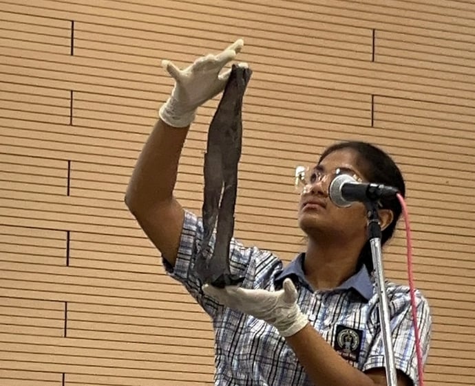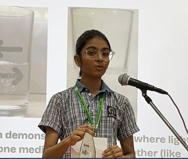 Kavya Dadhaniya captivated the audience by spinning a disc painted with VIBGYOR colours. As it rotated rapidly, the disc appeared white, vividly proving that white light is composed of seven colours.