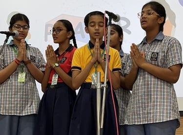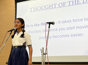 The assembly began with a soulful Sanskrit prayer recited by Saksham Kulkarni, followed by Dhvanil Rawat who presented global dance news, emphasizing the far-reaching influence of this dynamic art form. Aliya Laheri delivered a heartfelt message with expressive gestures, highlighting the physical, emotional, and therapeutic benefits of dance. A compelling speech by Sakshi Thakur advocated for the inclusion of dance in children's education as a medium to enhance confidence, discipline, and creativity.