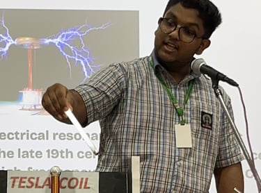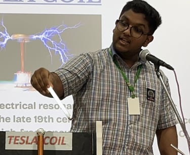 Aryan wowed the audience with a Tesla Coil demonstration, lighting discharge tubes wirelessly—a spectacular example of electromagnetic induction in action.