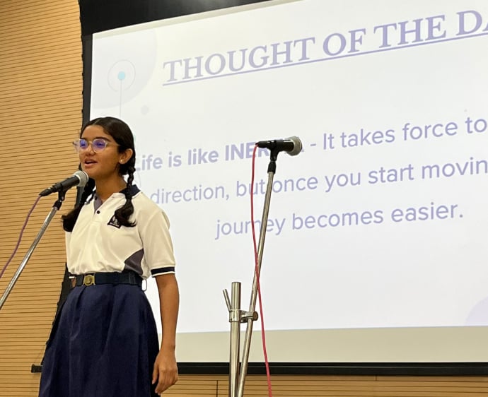 The assembly began with a Sanskrit shloka chanted by Arya Ribadiya, followed by a Gujarati prayer that calmed the atmosphere and set a spiritual tone. This was followed by the Word of the Day, presented by Vansh and Neerja, and a motivational Thought of the Day shared by Siddhi Mishra. Siddhi Bharati kept everyone informed with the day’s news highlights.