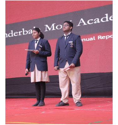 The School Student Council, led by Head Boy Aryan Nair, Head Girl Gloria Biju, and council members Nidhi Bhandari and Tamana Mazumdar, presented the Annual Report, which highlighted the school’s achievements, initiatives, and milestones over the past year. Their comprehensive presentation reflected the school’s commitment to academic excellence and holistic development.